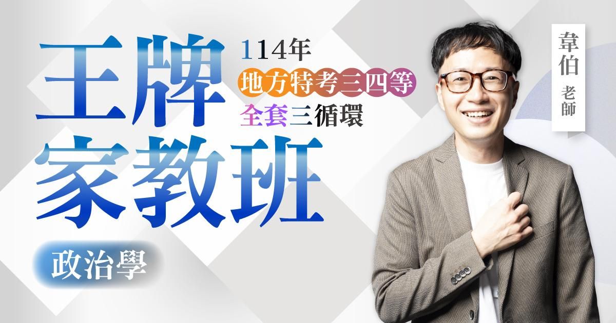 韋伯老師曾轉戰各大學轉學考及研究所考試,並取得四次榜首、一次榜眼、一次探花的好成績。將個人經歷與近十年授課經驗,獨創「拆解式理解法」,輔導多位高普考政治學同學創下「單題滿分」以及「高分錄取」之紀錄。